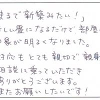 お客様からの声が届きました。 今回は初めての畳替えを当店にご依頼頂き感謝申し上げます。畳の仕上がりにも満足して頂いたようで何よりです。次回の畳替えのご依頼もお受けいたしました。またお会いできる事を楽しみにしております。あ …
