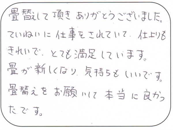 初めての畳替えを多くの畳店の中から当店に畳替えのご依頼頂き感謝申し上げます。新しくなった畳そして当店の作業内容にも満足頂き嬉しく思います。その後、畳の事で何かお気づきの点はありませんでしょうか?ございましたら遠慮なくお申し付けくださいませ。