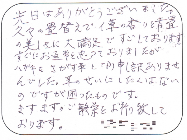 畳替えのご依頼頂き感謝申し上げます。当店へは初めてのご依頼でしたが新しい畳に満足頂いているようで何よりです。何か気になる点、お困りの事がありましたらお知らせ下さい。この度は大変ありがとうございました。