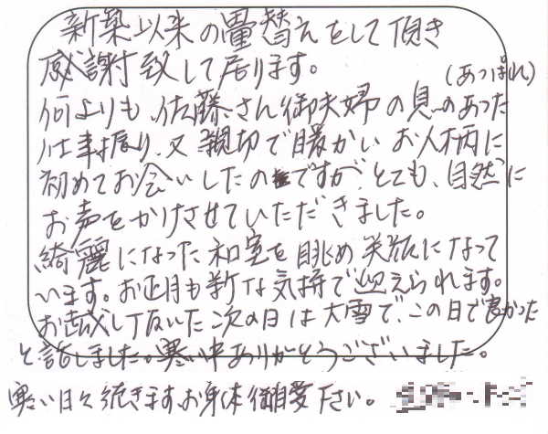 この度は畳替えのご依頼を多くの畳店の中から当店にご依頼頂き感謝申し上げます。綺麗になった畳に満足頂き私達も嬉しく思います。お正月にはお客様が来れれるのでしょうか?綺麗になった畳で快適にお過ごしください。ありがとうございました。