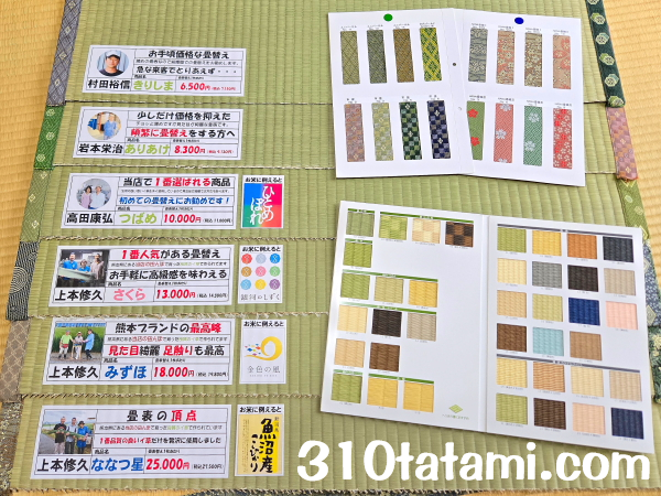 畳表、畳縁、畳床などのサンプルを持参しますのでお客様に選んで頂きます。畳表は10種類ほど畳縁は100種類ほどあります。畳表は実際に使用しているサンプルを持参します。見て触って納得のいく品物をお選びください。またサンプルをお客様にお貸ししてユックリと材料を選んで頂く事も可能です。