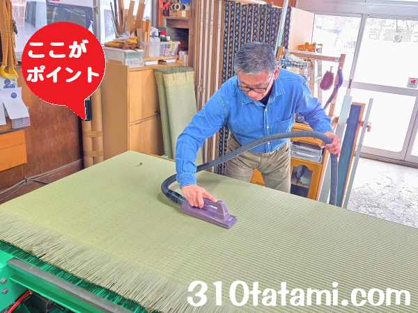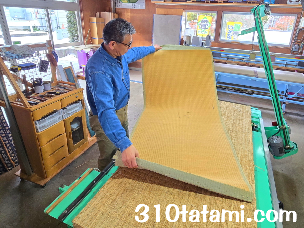 ホコリを取り除いた畳床にお客様が選ばれた新しい畳表を縫い付けます。