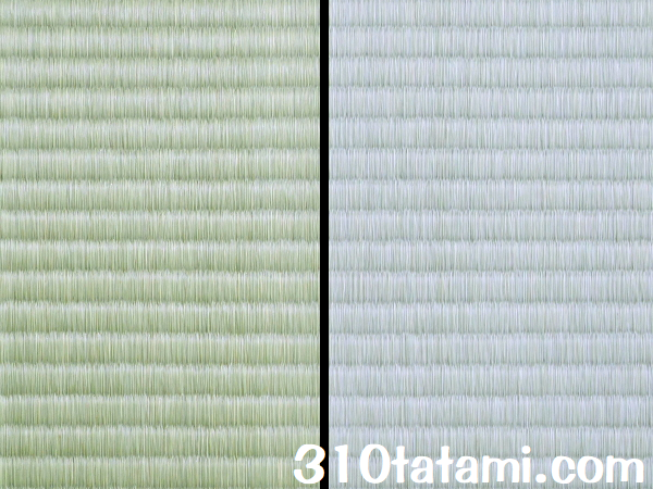 画像左側が白い粉を取り除いた状態。畳表本来の色が出て艶が出て来ました。この作業の後に防カビ加工を施します(一部商品を除く)