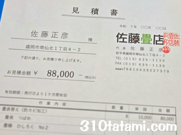 見積書を提出しますのでご検討頂き正式な畳替えのご依頼をお待ちします。 ここまでが畳替え作業する前の準備になります。この後お客様と畳替え作業を行う日時を決めます。