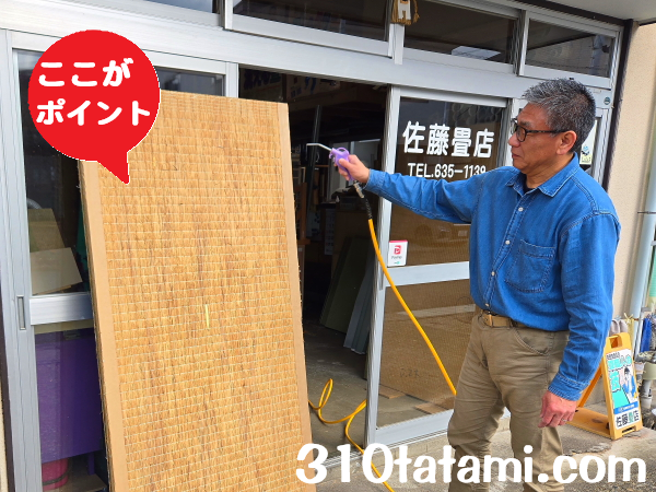畳表の表面には白い粉(泥)が付いています。これはい草の粘り、弾力性、艶を保つものですが衣服に付くと白くなってしまいますので畳をお持ちする前に当店の方で専用ブラシにて白い粉を取り除きます。